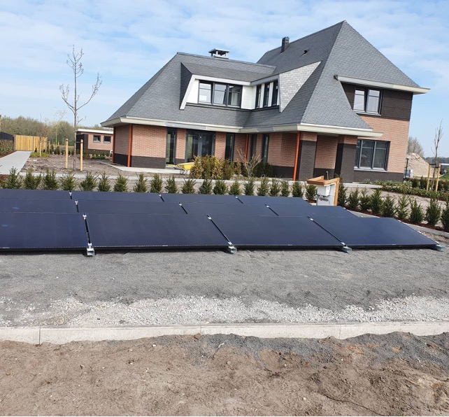 Vrijstaande woning voorzien van zonnepanelen voor het huis op een grote open plek. De omvormer onder een afdakje geplaatst.